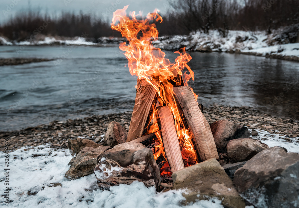 campfire on the winter river bank