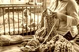 woman knits scarf with thick threads