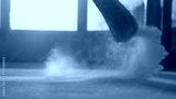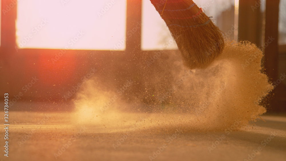 LOW ANGLE: Dust gets swept up into air as person cleans a construction site