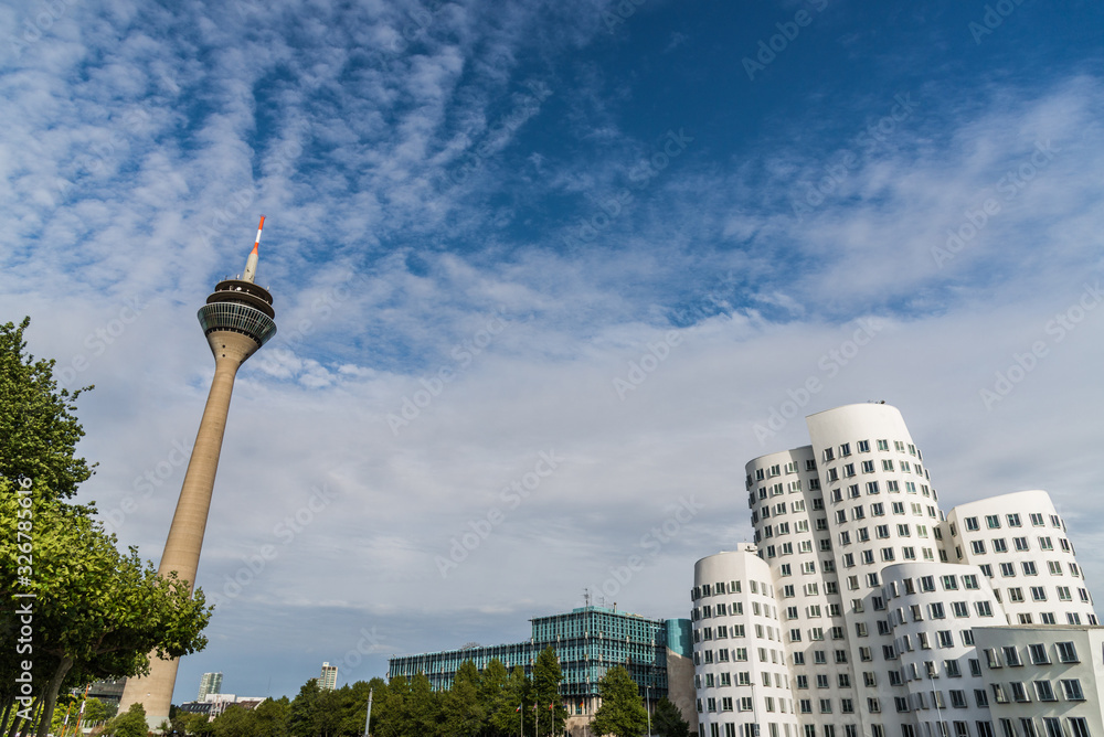 View at Medienhafen Zollhof district and Rheinturm tower in Dusseldorf, Germany
