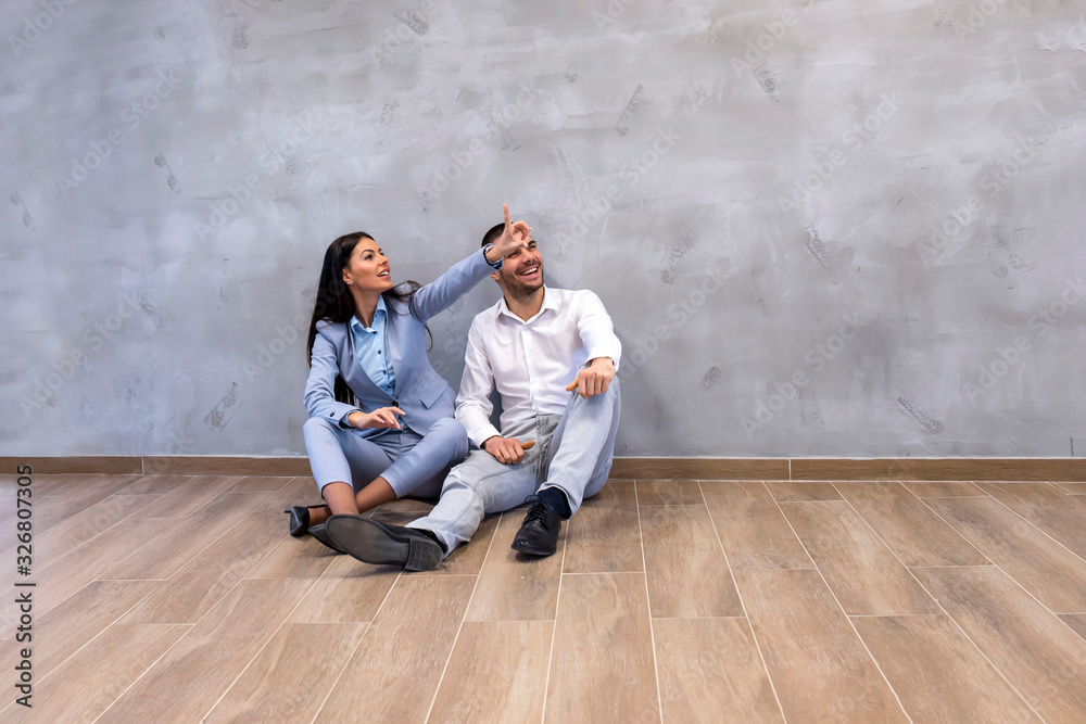 Excited couple sitting on the floor of empty new apartment, planning arrangement and decoration