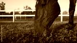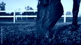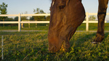 CLOSE UP: Beautiful dark brown stallion gazing and chewing grass at sunset