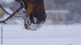 CLOSE UP: Dark bay horse playing with fresh snow in beautiful white winter