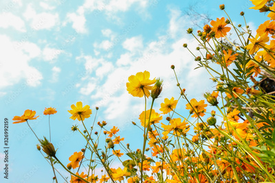 Yellow Cosmos flowers field at out door with blue sky ,nature background.