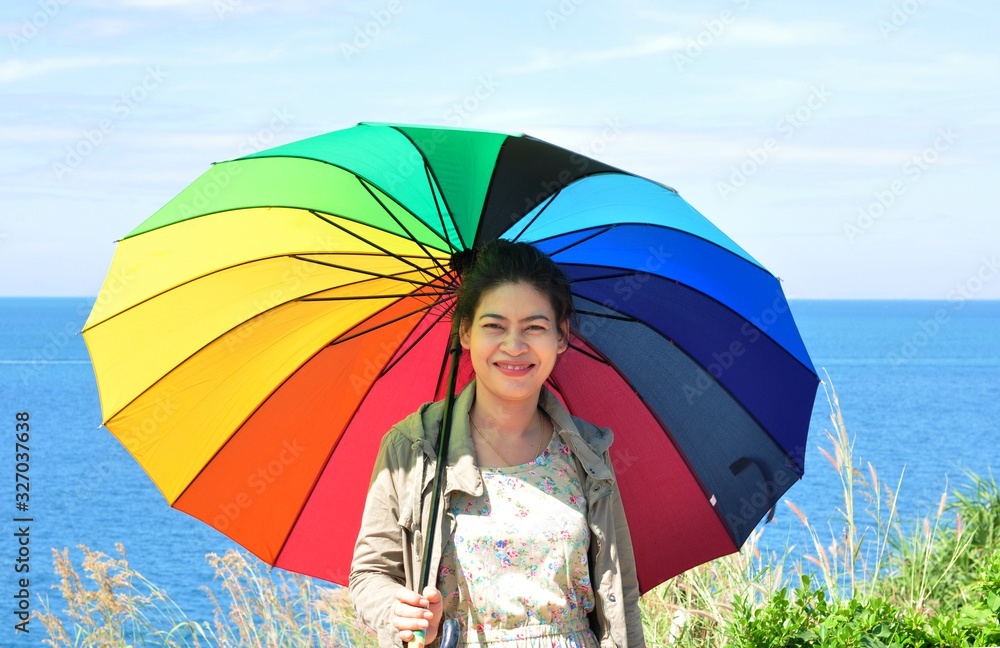 Beautiful women with colorful umbrellas on a hill overlooking the seaside of Koh Samet.