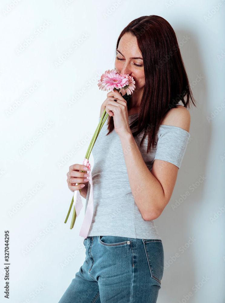 European, young brown-haired woman in a grey top and jeans with pink flowers, gerberas, portrait of a girl,