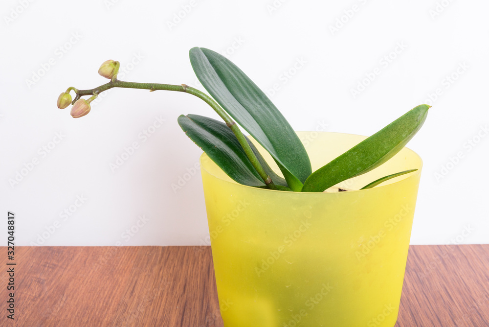 Beautiful orchid with non-bloomed buds close-up. Growing orchids at home.