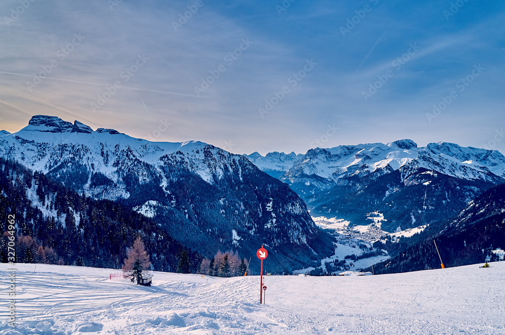 Beautiful panoramic view to the Sellaronda - the largest ski carousel in Europe - skiing the four most famous passes in the Dolomites (Italy), extraordinary snowy peaks of the dolomites, southern alps