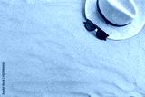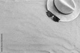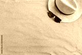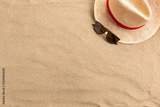 Straw hat and sunglasses, on sand background. Beach vacation concept .Top view with copy space.
