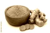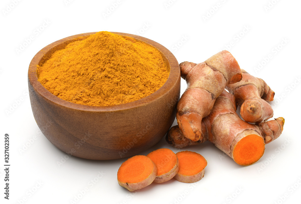Turmeric powder in a wooden bowl and turmeric (curcumin) rhizomes isolated on a white background.
