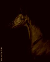 Portrait of a beautiful chestnut arabian horse on black background isolated, head closeup