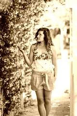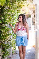 Young woman girl looking up in summer on sunny day in garden touching vine plant flowers outside wearing pastel fashion