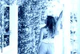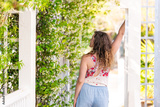 Young adult woman girl person in summer on sunny day in garden vine plant flowers outside gardening and wearing pastel fashion