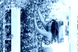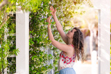 Young adult woman girl in summer on sunny day in garden touching vine plant flowers outside gardening and wearing pastel fashion