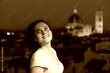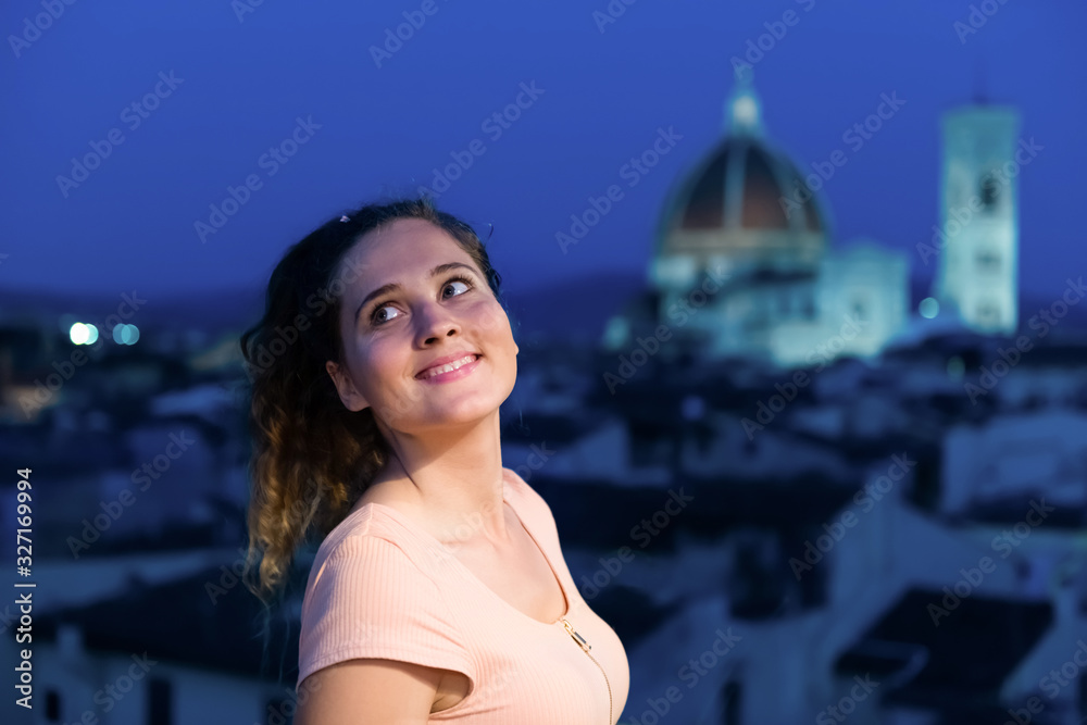 Florence, Italy historic city with architecture church dome and face of young woman girl tourist standing looking at view