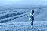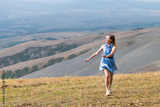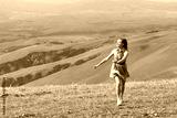 Woman girl in polka dot dress walking in Val D'Orcia autumn countryside in Tuscany, Italy with farm landscape idyllic picturesque meadow