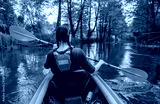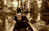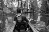 A woman kayaking down the river Wda in Kaszuby, Poland
