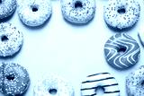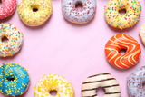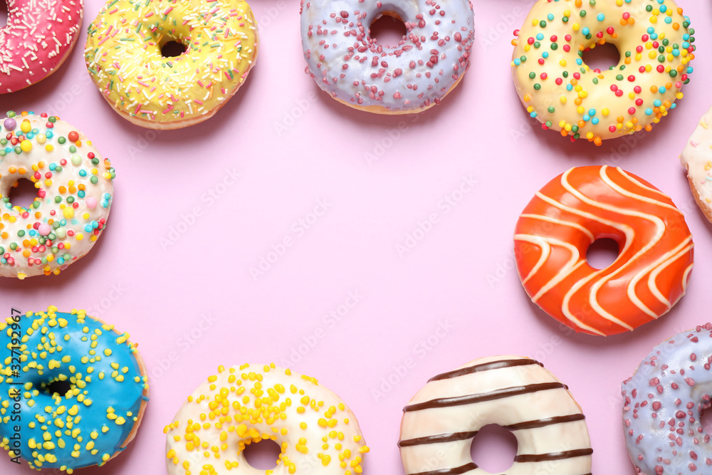 Delicious glazed donuts on lilac background, flat lay. Space for text