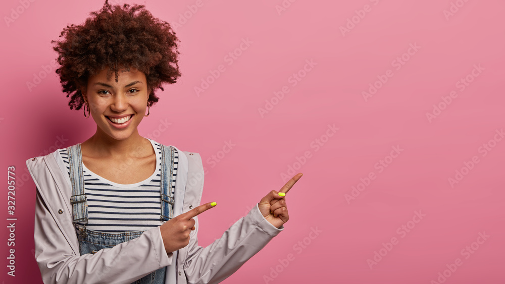 Young delighted curly African American woman has cheerful expression, points aside with fore fingers, shows blank space for your advertising content, wears grey jacket, poses over pink background