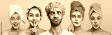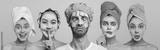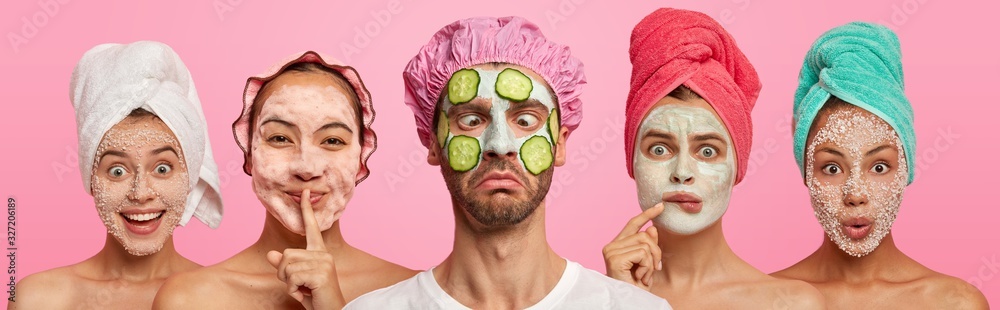 Funny crazy man crosses eyes, applies slices of cucumbers and clay mask, wears bath hat, stands between four women with towels on heads, applied scrubs or clay masks, pose all together indoor
