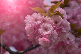 Close up of beautiful pink cherry blossom-sakura flower. Springtime blooming plants. Selective focus and blurred background. Spring nature.