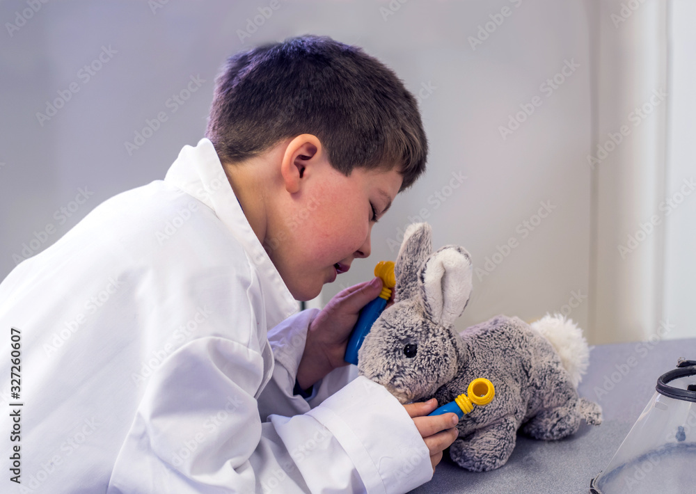 Young dr talks to his bunny patient