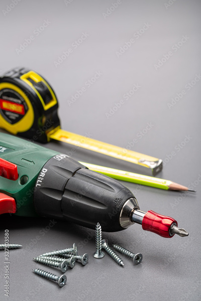 Tools for home repair. Screwdriver, pencil, tape measure and screws. Copy space, studio shot.