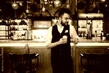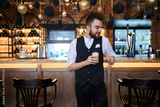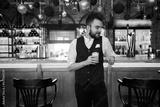 young man in fashion uniform inspired with good tasty latte, shop assistant looking aside , close up photo