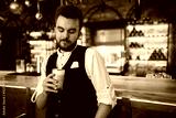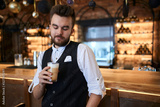 awesome young professional barists drinking cuppuchino, looking at the glass, digusting the beverage. close up photo