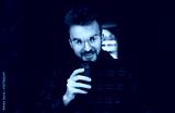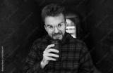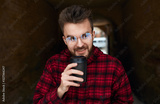 cheerful pleasant guy in glasses holding a cup of latte, enjoying drinking it, thinking about his work, business. lifestyle. close up photo