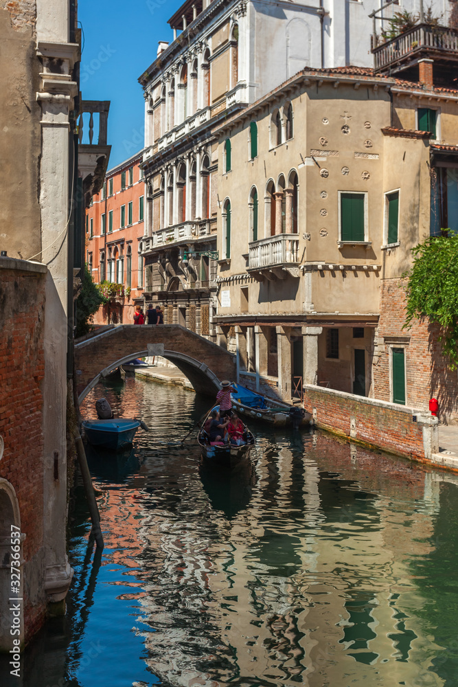 View of narrow Canal with boats and gondolas in Venice, Italy
