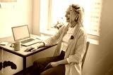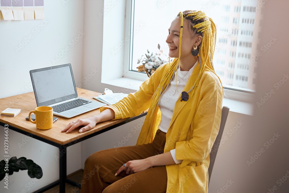 girl laughing while sitting on the chair. close up side view photo, happiness, positive feeling and emotion, girl have fun while working with laptop. spare time, freelancer enjoying her free time