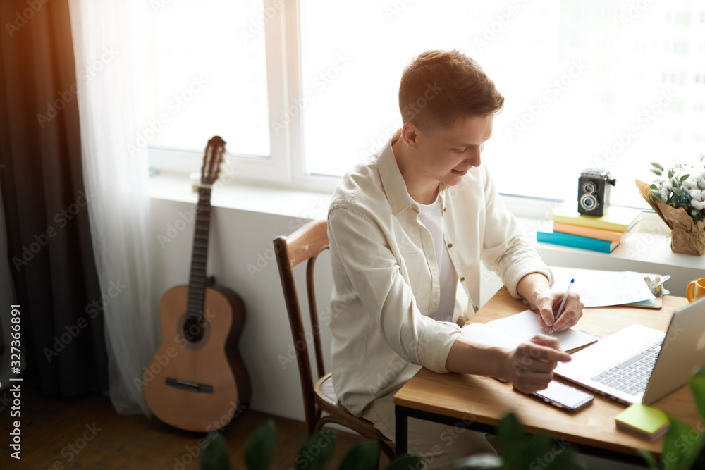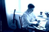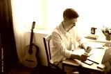 talented composer enjoying writing a music for song, write making up a lyrics. close up side view photo, hobby, interest, lifestyle, inspiration