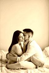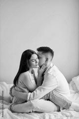 young couple kissing , embracing on the bed. man and woman haven't seen each other for a long time, they have met and was waiting for the date. pleasant moment