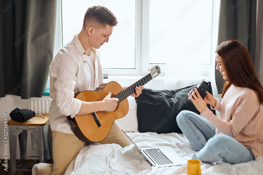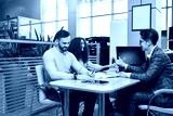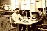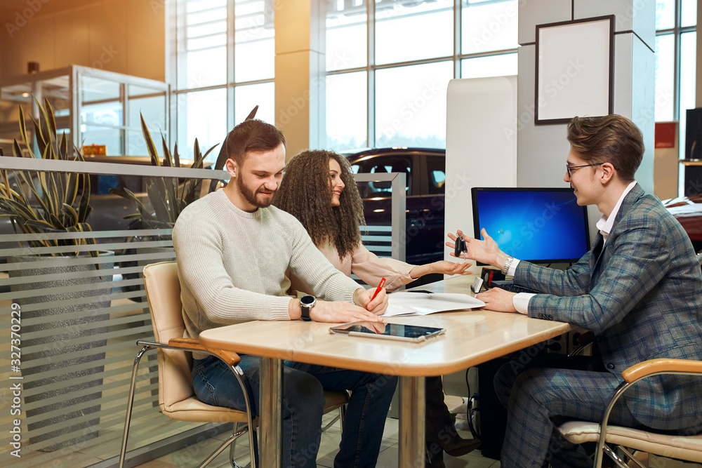 young handsome elegant dealer giving keys of the car to a man and a woman while sitting at the table, happiness, success, positive feeling and emotion