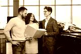 attractive couple buying a new car from a salesman, man holding folder, documents talking about features of vehicle, sale, discount. close up photo