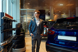 young elegant man thinking of a purchase, close up photo. copy space.young shop assistant has spare time, having a rest, free time, lifestyle