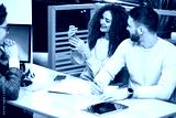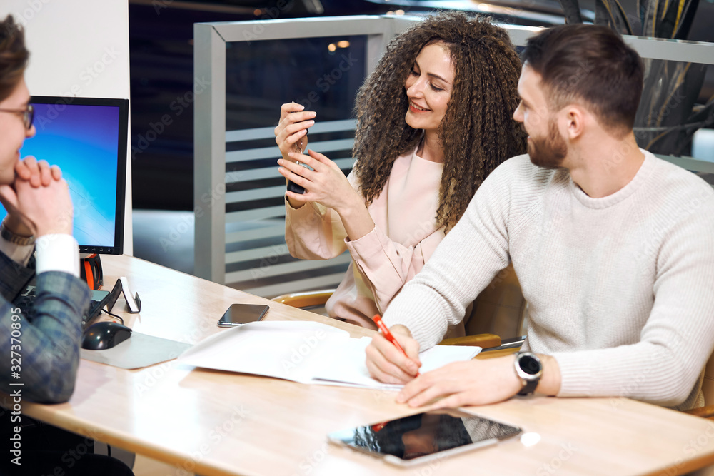 family sitting at desk, happy woman holding keys.enjoyment, happiness, close up photo. young bearded man signing contract. looking at his cheerful wife