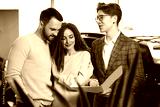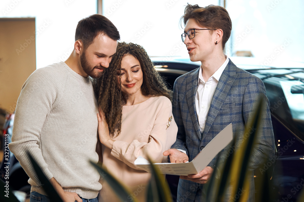 young couple are going to sell used car, consulting with manager, shop assistant. close up photo