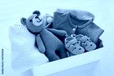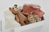 Box with baby stuff and accessories for newborn on bed. Gift box with knitted blanket, clothes, socks, shoes and toy. Baby shower concept. Flat lay, top view
