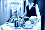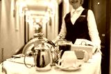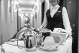 All that you need. Waitress in uniform delivering tray with food in a room of hotel. Room service. Focus on tableware