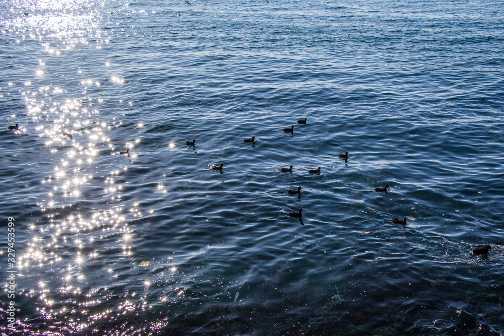 White seagulls and black ducks in the beautiful sea on display