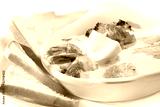 cream soup with prawn,scallops and mushrooms,isolated on white