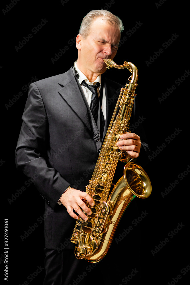 Musician playing saxophone (isolated on black background)