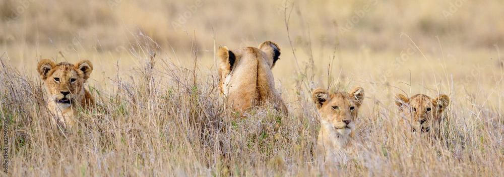 Lioness and heads of three baby lions in the Serengeti grasslands, Serengeti National Park, Safari, East Africa, August 2017, Northern Tanzania