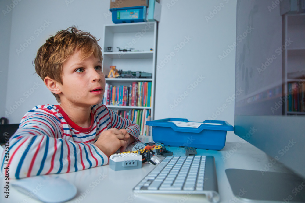 child building and programming robot on computer