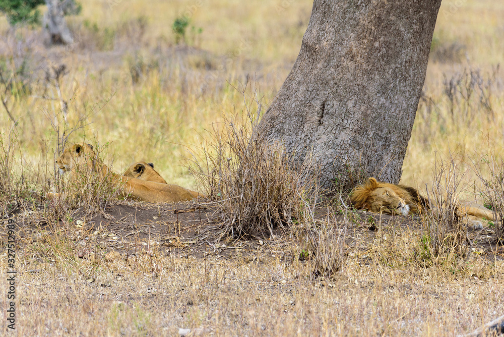 Sleeping lion and two lionesses (Panthera leo) under a tree, Serengeti National Park, Safari, East Africa, August 2017, Northern Tanzania