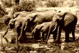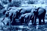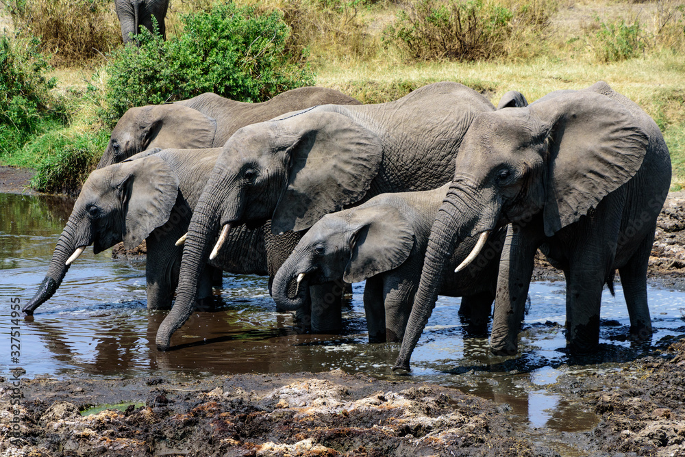 A group of African elephants (Loxodonta africana) drinking in a water hole, Serengeti National Park, Safari, East Africa, August 2017, Northern Tanzania