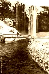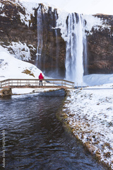 Selyalandfoss waterfall in Iceland. Tourist enjoys the view of the river cascade
