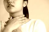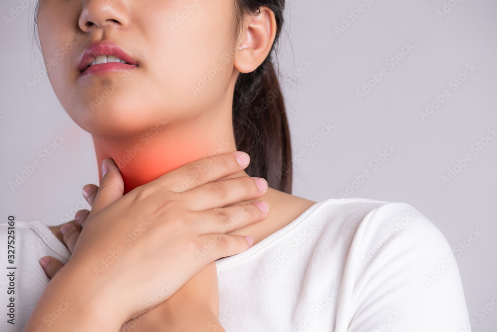 Sore Throat. Closeup Of Beautiful Young Woman Hand Touching Her Ill Neck. Healthcare and medical concept.